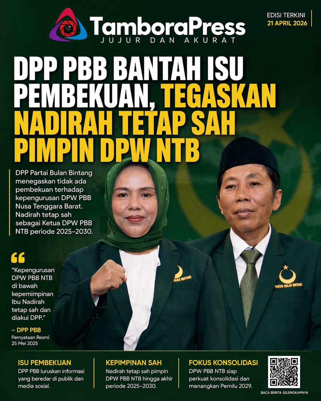 Jakarta, (tamborapress.com) — Dewan Pimpinan Pusat (DPP) Partai Bulan Bintang (PBB) akhirnya angkat bicara terkait isu pembekuan kepengurusan Dewan Pimpinan Wilayah (DPW) PBB Nusa Tenggara Barat (NTB). Melalui siaran pers yang diterima tamborapress.com, pada Selasa (21/04/2026) petang tadi, DPP menegaskan bahwa kabar tersebut tidak benar.